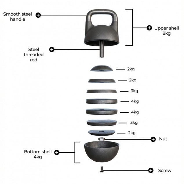 2187 identifies a kit consisting of a 12 kg kettlebell and 7 custom discs to be inserted inside it, designed to allow manual weight adjustment from 12 to 32 kg, achievable through different combinations of discs (19 selectable weights, with 1 kg increments, except for 13 and 31 kg). The kit also includes a 6mm Allen key and a 30mm box wrench.