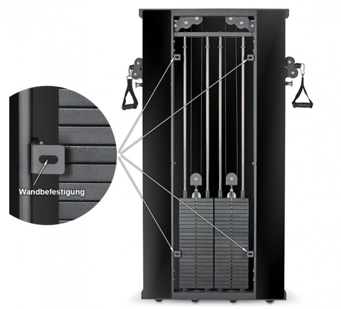 The modern wall pull station with black acrylic glass paneling allows you to perform silky-smooth pull training for maximum muscle feeling and optimal training stimulus, which is ensured by special, stretch-free pull ropes and ball-bearing aluminum pulleys.