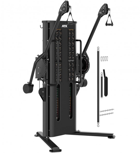This multi-pull station offers an extreme variety of pull angle positions. With two 90 kg weight plates , the device accommodates all intensity levels. Each lever arm offers 8 radial and 14 axial adjustments, resulting in a total of 112 different pull point settings. With a maximum pull distance of 260 cm and a maximum pull height of 205 cm , the device offers a wide range and thus covers virtually every conceivable pull point.