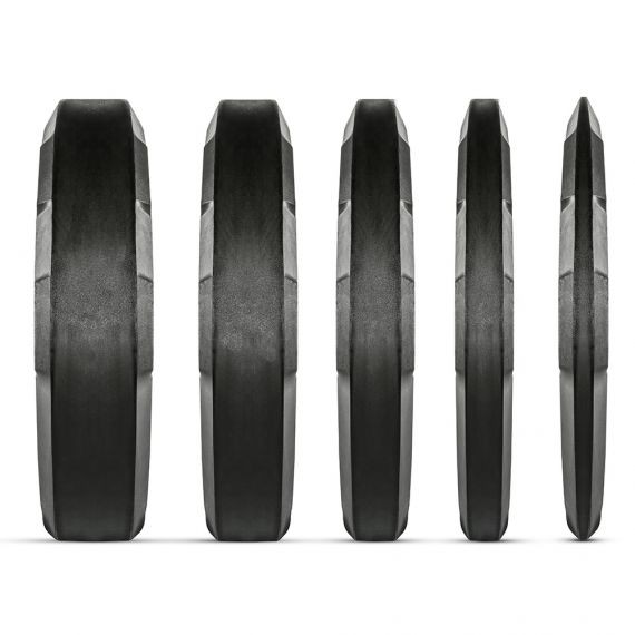 By peripherally beveled handle hub, the weight plates can be particularly good grip and thus provide an excellent handling. The flanged inner ring of stainless steel provides a quick and safe loading and unloading of the disc recordings. The high-quality rubber compound with hardness 90 (Shore A) provides excellent impact absorption.