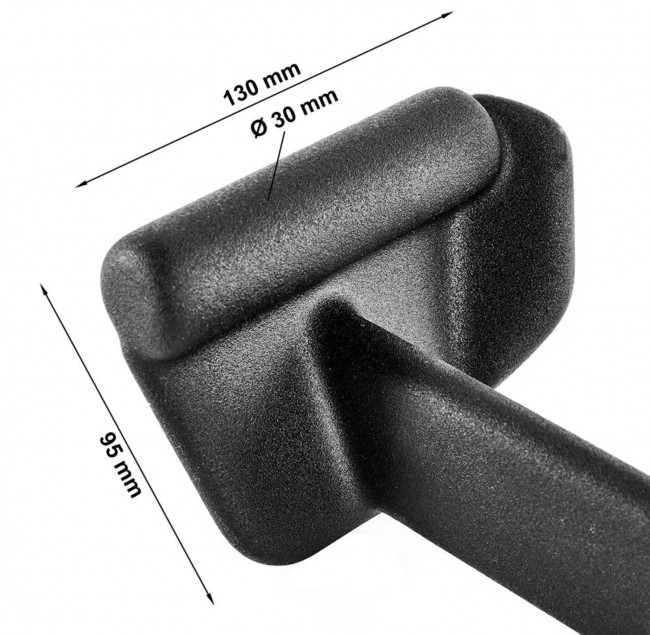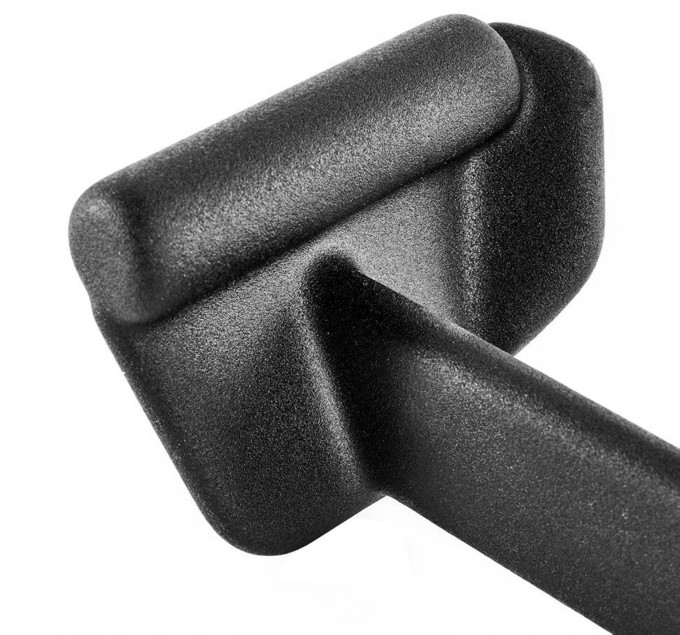 The extended grip fin supports the stabilization of the wrist axis and thereby helps to keep the elbows at the correct contraction angle to achieve optimal muscle contraction. The handle is made of 8 mm thick steel and coated with a 3 mm thick neoprene layer. The mounting hole has a diameter of 18 mm and is compatible with all standard carabiner hooks with a diameter of 6 - 10 mm. In addition, the coating prevents paint damage to frames and equipment.