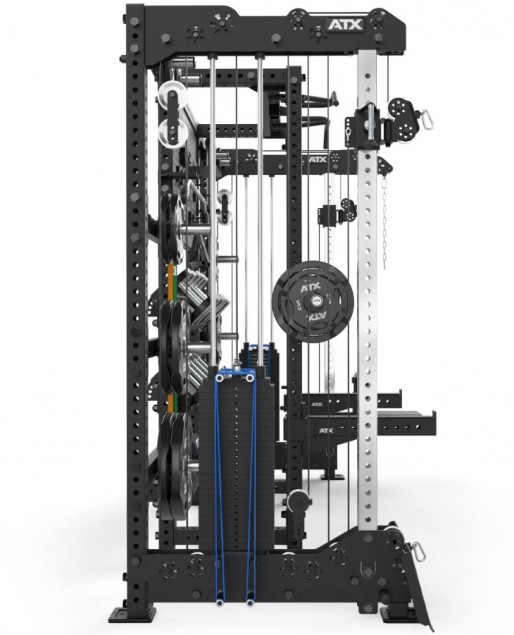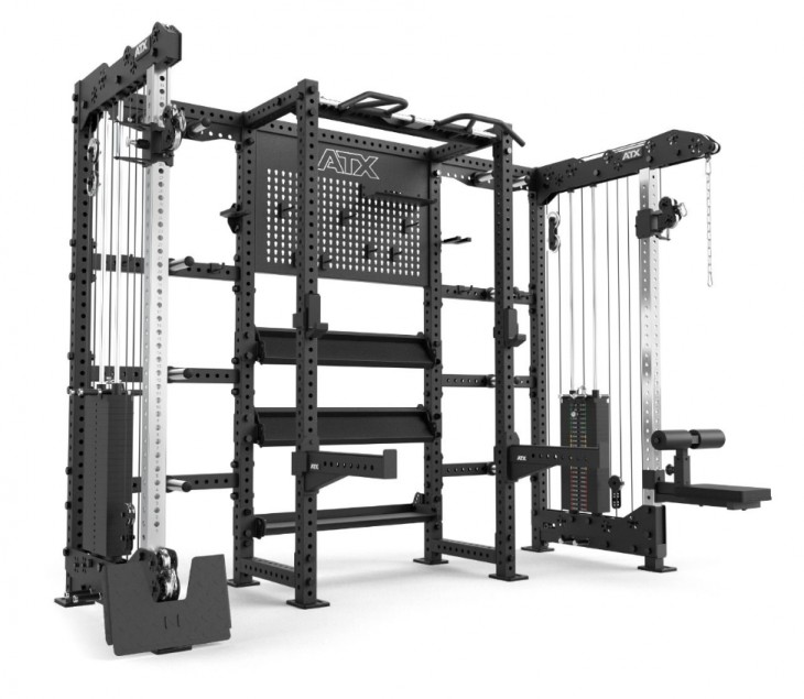 Our developers' primary goal was to integrate only absolutely professional base stations into this large piece of equipment without compromise . The lat pulldown station, for example, is a fully -fledged professional lat pulldown . 125 kg of plug-in weights with a direct 1:1 ratio and height-adjustable seat and cushioned roller adjustments will satisfy even the most powerful athletes. On the opposite side, 125 kg of plug-in weights with the same ratio are available for seated rowing, and the fold-down footrest ensures secure support. These pulldown stations are also equipped with a height-adjustable duplex roller (2:1 weight ratio), allowing various pulldown heights to be precisely adjusted. The synchronized design and weight placement of the two pulldown stations means that the popular cable cross, for example, can be perfectly performed . The integrated half rack is equipped with heavy-duty solid steel J-hooks and safety arms, and a knurled multi-grip pull-up bar is also integrated.
