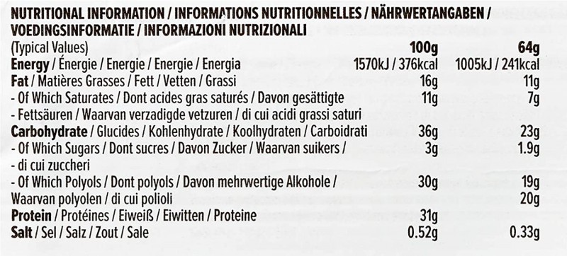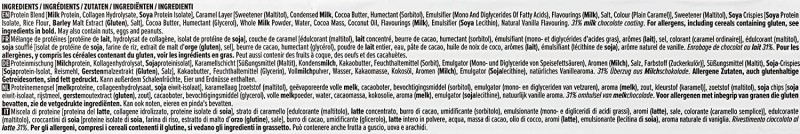 Protein Blend [Milk Protein, Collagen Hydrolysate, Soya Protein Isolate], Caramel Layer [Sweetener (Maltitol), Condensed Milk, Cocoa Butter, Water, Humectant (Sorbitol), Emulsifier (Mono And Diglycerides Of Fatty Acids), Flavourings (Milk), Salt, Colour (Plain Caramel)], Sweetener (Maltitol), Soya Crispies [Soya Protein Isolate, Rice Flour, Barley Malt Extract (Gluten), Salt], Cocoa Butter, Humectant (Glycerol), Whole Milk Powder, Water, Cocoa Mass, Coconut Oil, Flavourings (Milk), Emulsifier (Soya Lecithin), Natural Vanilla Flavour. 31% milk chocolate coating.