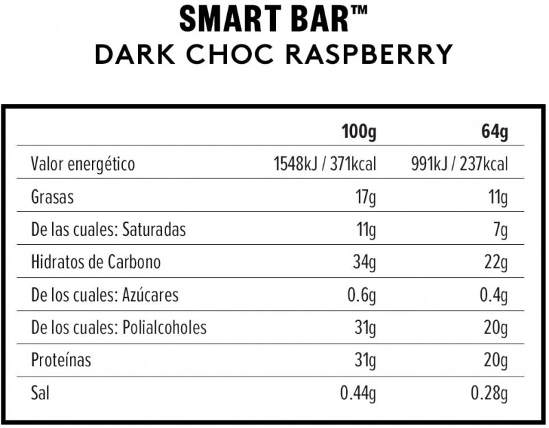 Dark Choc Raspberry Flavour: Protein Blend [Milk Protein, Collagen Hydrolysate, Soya Protein Isolate], Raspberry Flavoured Caramel Layer [Sweetener (Maltitol), Condensed Milk, Cocoa Butter, Water, Acidifying Agent (Citric Acid), Humectant (Sorbitol), Flavourings, Emulsifier (Mono And Diglycerides Of Fatty Acids), Salt, Colour (Carmine)], Cocoa Mass, Sweetener (Maltitol), Cocoa Soya Crispies [Soya Protein Isolate, Tapioca Starch, Cocoa Powder], Humectant (Glycerol), Water, Cocoa Butter, Coconut Oil, Cocoa Powder, Flavourings, Emulsifier (Soya Lecithin), Natural Bourbon Vanilla Flavour. 31% dark chocolate coating.