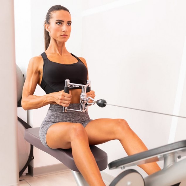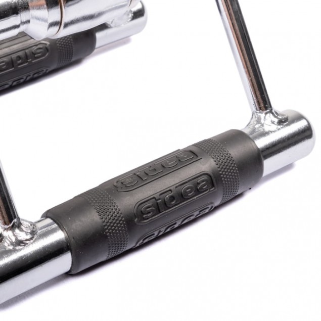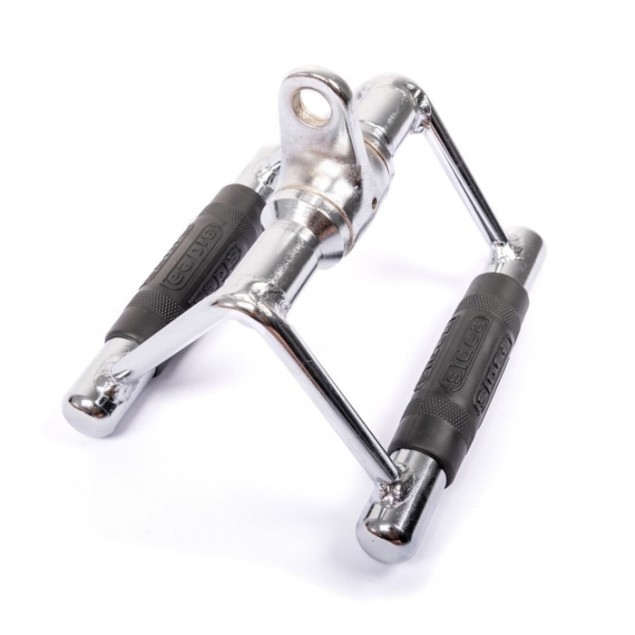Bar Combo / Triangle for Pulley Handgrips 11 cm. Revolving pulley V-shaped press down handle, with revolving hinge and rubber grips. The textured rubber surface increases a firm grip. The V-shape provides a balanced force to both arms. The rotational knuckle offers a full 360-degree movement, ideal for angle turns or exercises needing additional angle around elbows, back, shoulders, and wrists.