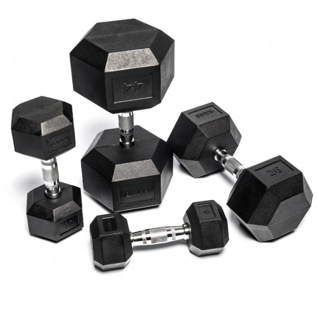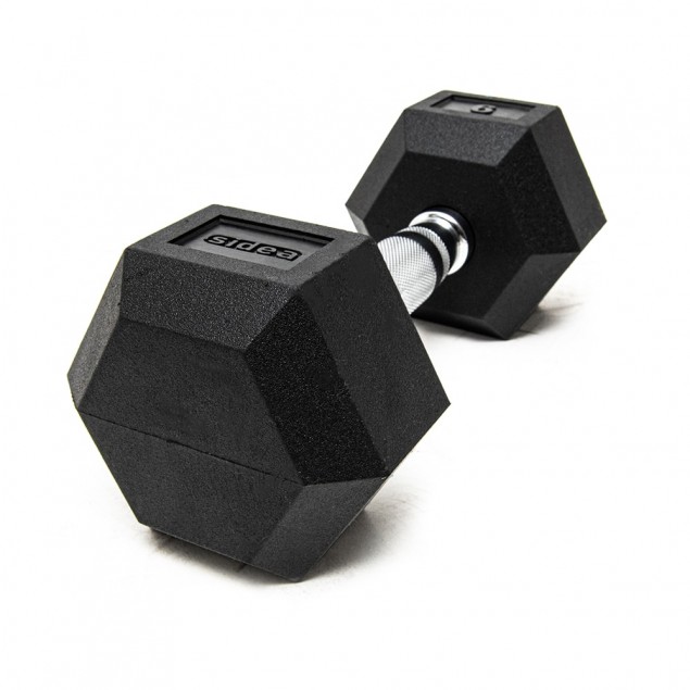 Professional fixed rubber dumbbell with hexagonal head for intense use. Distinguished by a strong design and high quality rubber that guarantees great value for money. The shaft is fixed through a security plate welded to cast-iron plates to limit the possibility of detachment of the plates even during cases of improper use. Every dumbbell is marked with the weight in kg. The handle has a deep knurl and does not rotate; therefore, training is not lightened by the lack of inertia due to rotation of plates. Training is a full and high-impact workout.