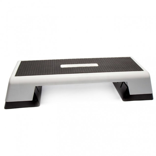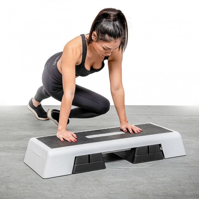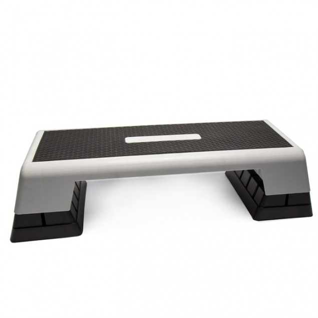Premium step – Adjustable step. High-quality professional step featuring a large platform, high stability, robustness, no edges, and superior finishing. The rubber top is 37 x 97 cm, and the raiser blocks allow to adjust the step to 3 heights: 15, 20, and 25 cm. The adjustable height boosts the intensity of your workout.
