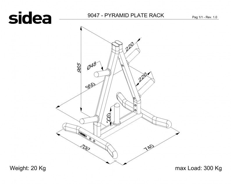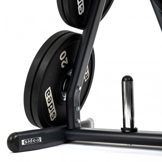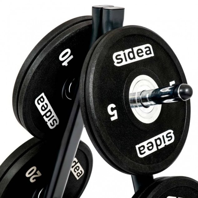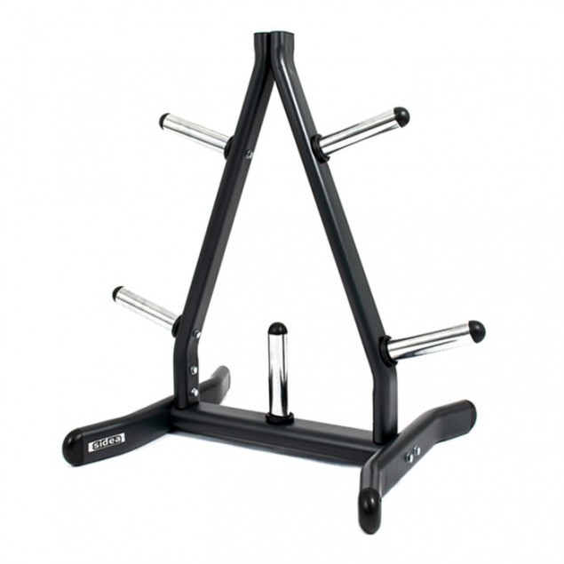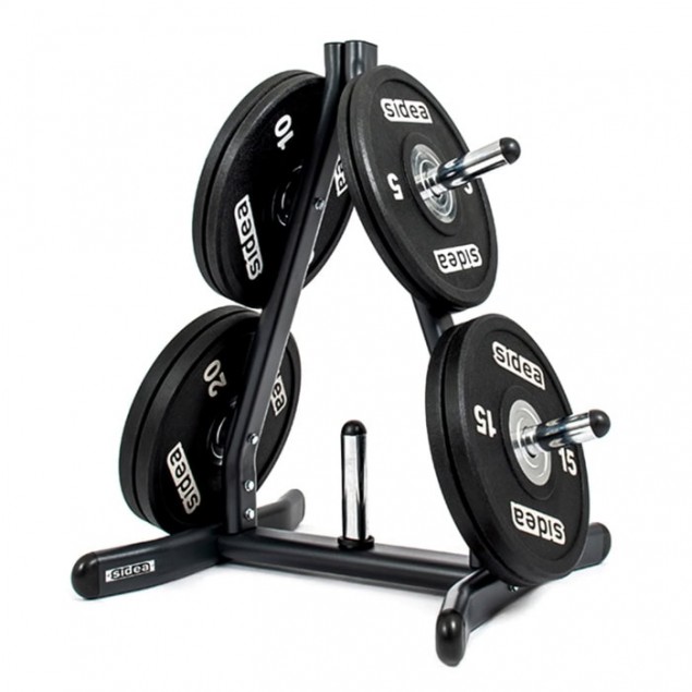 Compact framed storage rack for weight plates with a 50 mm hole. The accessory is structured with a tubular micaceous section. The distance between each of the 20 cm long tubular weight plates-holder is 42 cm. This feature facilitates the insertion of additional bumper plates positioned at the same time both in the top part and bottom part of the storage rack. The central pivot can accommodate discs up to a maximum total diameter of 30 cm.