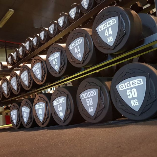Each dumbbell is marked with its weight in kilograms and can be quickly stored on the dedicated Dumbbell Rack (code 8880), designed for efficient organization with a space-saving sliding system.