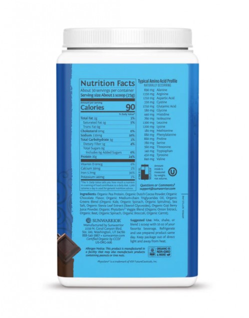 Organic Pea Protein, Organic Dutch Cocoa Powder, Organic Chocolate Flavor, Organic Medium-chain Triglycerides Oil, Organic Greens Blend (Organic Kale, Organic Spinach, Organic Spirulina), Sea Salt, Organic Stevia Leaf Extract (Steviol Glycosides), Organic Goji Berry Juice Powder, Organic PhytoServ® Veggie Blend (Organic Onion Extract, Organic Beet, Organic Spinach, Organic Broccoli, Organic Carrot).