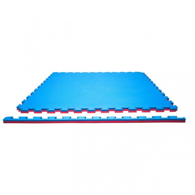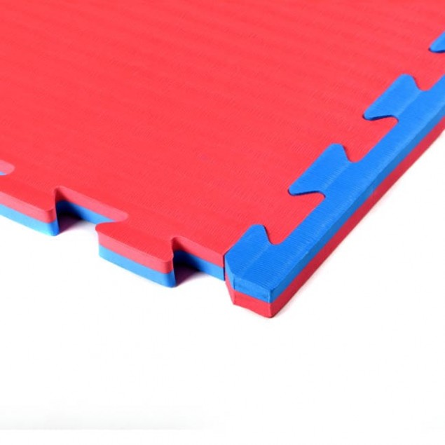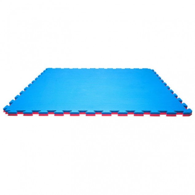 EVA Tatami flooring, with puzzle interlocking, 2 cm thickness and blue-red color. This flooring is particularly used for martial arts and sports activities in general, where it is necessary to have a surface with high absorption capacity and an improved degree of support, stability, and adherence. The optimal proportion between absorption and stability is determined by the extraordinary mechanical characteristics of EVA: more “rubbery” and resistant than other polymers. The adherence is guaranteed by a non-abrasive rice straw embossed surface, suitable for ground training such as Primitive Functional Movements.