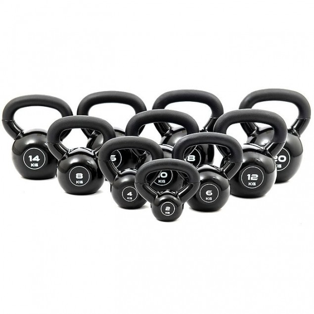 The VINYL KETTLEBELL set is available in sizes from 4Kg to 12Kg – in 2Kg increments